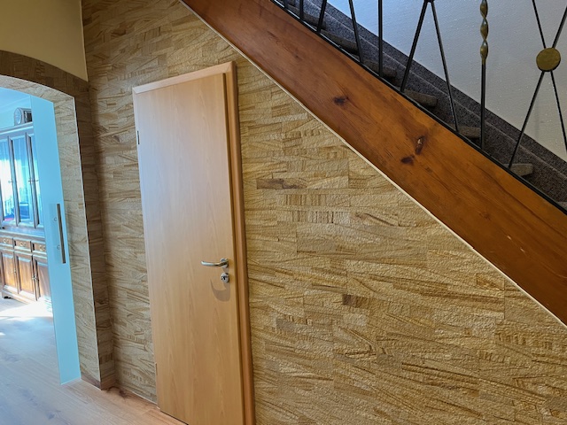 Rechteckige Module: 1-3 mm starke Steinstreifen aus echtem Naturstein als Modul vorverklebt zur fugenlosen Verlegung rückseitig mit Harz und Glasfaser verstärkt, Sandfarben matt, passt hervorragend zu allen Holzarten Anwendungsbeispiele: Dünnschiefer Verblender Teakwood Dünnschiefer Verblender Teakwood Dünnschiefer Verblender Teakwood Größe der Module: 60×15 cm ca. 1-3 mm dick Geeignet: für den Innen- und Außenbereich z.B. am Kamin, als Verblendung der Küchenrückwand, am Haussockel, im Bad … Material: Sandstein 4-5 Streifen pro Modul Gewicht ca. 3 kg / qm Zusatzinfos: im 10er Pack / 0,9 mqm pro Paket wird im Paketversand angeliefert Leicht mit einer Trennscheibe (Flex), Stichsäge oder einer scharfen Schere zu schneiden